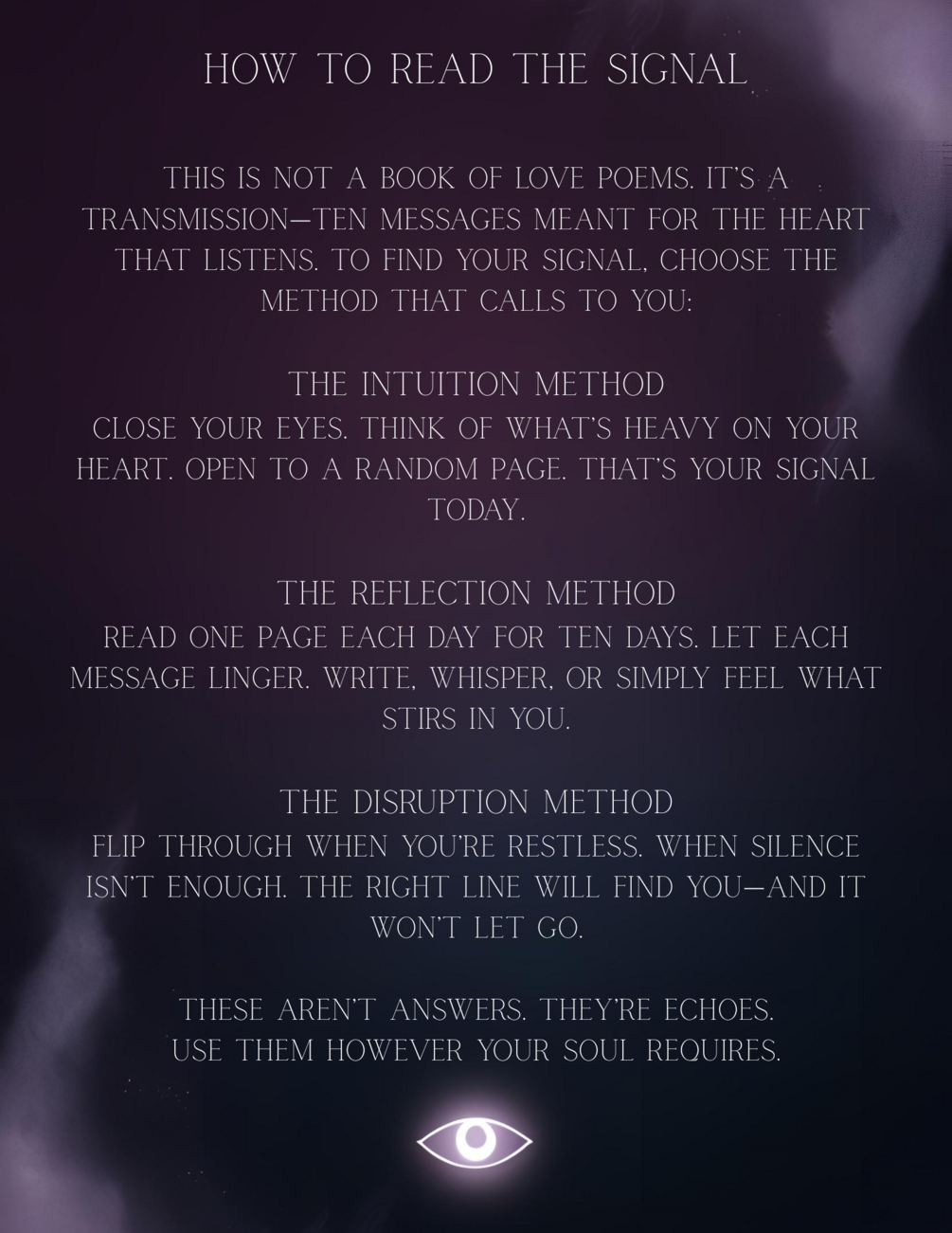 Love Signal: 10 Fortunes to Stir the Heart is a downloadable PDF containing 10 haunting, intimate messages designed to speak directly to your romantic intuition. Each page is short, mysterious, and eerily personal—like the universe left you a note.